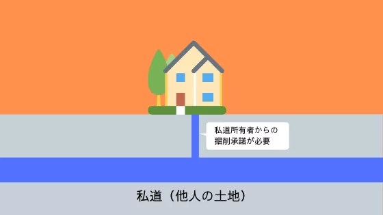 敷地前面の道路が私道の場合、あなたの土地ではないので、勝手に掘削することはできず、所有者に掘削承諾を貰う必要があります。